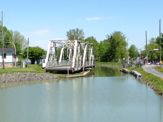 Running north from Lake Champlain, we entered the Richelieu River.  Contrary to popular conception, Lake Champlain does not drain south to the Hudson River but drains north via the Richelieu River to the St. Lawrence. The first 18 miles heading north is a beautiful and navigable river. We encountered our first French village – Saint-Jean-de-Richelieu – at the first lock (known as Lock 9), which marks the beginning of the incredible 10 mile Chambly Canal, which has a total of 9 locks. After the first lock, one enters a narrow canal with 7 bridges but no locks in the first 9 miles. All the bridges are low and must be opened.  The speed limit is 6 mph and passage through the canal is timed and controlled from when you pass through Lock 9. The bridge attendant then drives from bridge to bridge to open each bridge as you arrive. The bridges are old, quaint, and unique – here are pictures of two of them:
