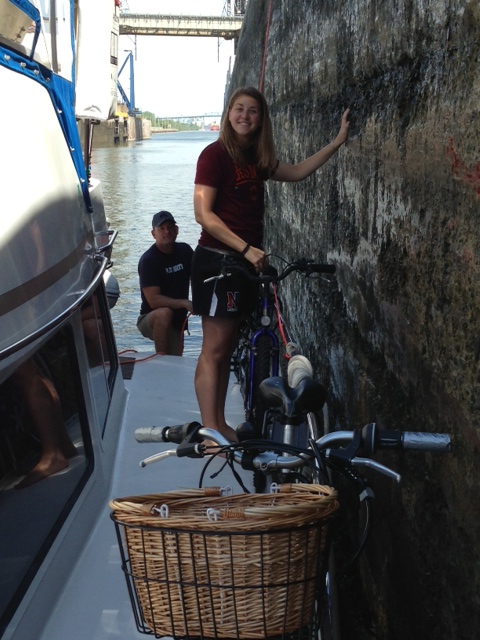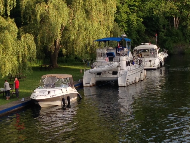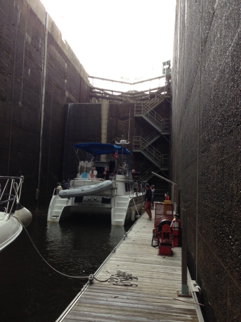 Fuel costs generally between $4 and $5 per gallon. We will probably travel 6,000 miles or so – at $4.50, fuel costs will run around $9,000 for the trip. When divided up among those on board at any given time, the cost is not bad considering it is a year-long trip. So far, we have stayed in marinas or tied to seawalls in towns and canals. We purchased a season-long Canada Pass for $600 which pays for all our lockages in Canada and allows us to tie up to any available seawall for free, except for a $10/night charge for electric if it is available. Many towns provide seawall space for free as well to encourage boaters to stop overnight – our 7 nights in downtown Toronto cost just $10/night for the electric hookup. Once we’re in the Great Lakes and beyond, we’ll likely do some anchoring and staying on moorings, which are cheaper than marinas. Marinas usually cost between $1/foot and $1.75/foot in this part of the country (times 34 feet) – again, not too bad when divided among those on board.