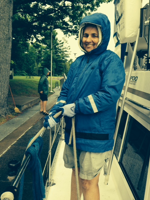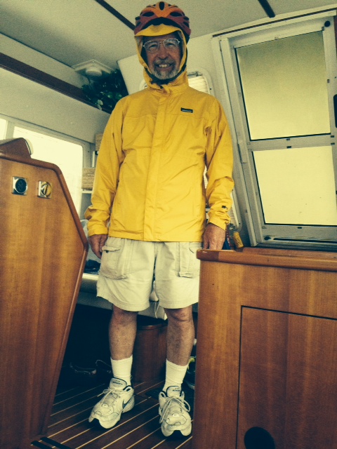One last image – I really wanted to watch the Brazil-Germany World Cup semi-final, but the nearest pub with a TV was a quarter mile away and it was absolutely pouring rain and would not let up – so I decided to ride my bike through the rain. Pat snapped this picture as I was about to leave the boat and made me agree to put it in the blog. Of course, the rain stopped 10 minutes after I got to the pub.