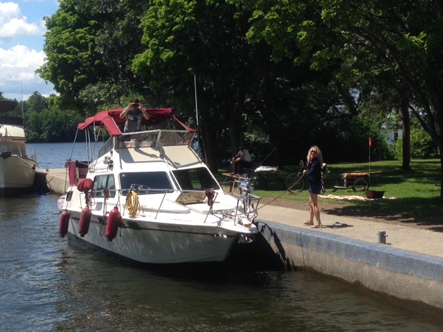 Sunday we arrived at Young’s Point late in the afternoon, as the Peterborough Lift Lock was closed for repairs until noon. Sometimes a Chance Encounter has surprising results. While we were fueling up at the dock, a grandfather with his son and two grandkids in tow (ages 3 & 4) asked if the kids could look inside the boat. After we were done fueling, we hoisted them aboard and gave the whole group a tour. Later that evening, we happened to sit a few tables from them in the restaurant overlooking the dock. Before we knew it, an order of bruschetta arrived, compliments of the grandfather. We finished dinner and were preparing to leave when a bottle of wine arrived, also compliments of the grandfather – not that we needed to drink another bottle of wine at that point, but what could we do?