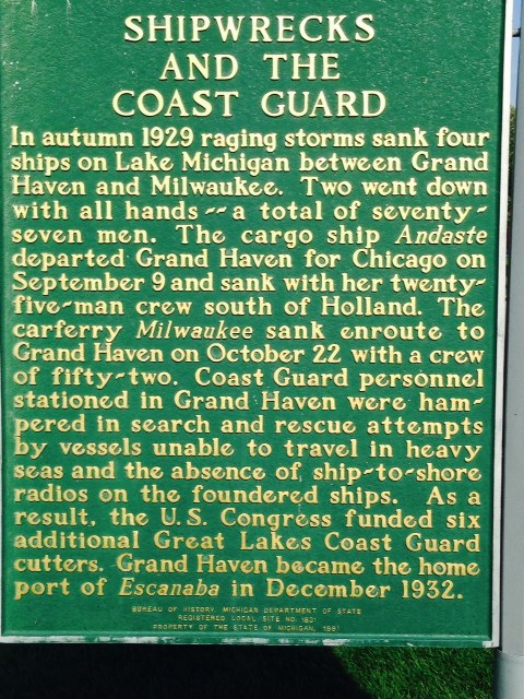This historical marker shows how treacherous Lake Michigan and the Great Lakes can be in storms, especially in the fall and winter (which is one reason we’ll be off Lake Michigan by September 1). You may recall the song “The wreck of the Edmund Fitzgerald” by Gordon Lightfoot. The 729 foot Edmund Fitzgerald hauled iron ore from the mines near Duluth, Minnesota to Detroit, Toledo, and other Great Lakes ports for 17 years – she set seasonal haul records 6 times, often breaking her own record. However, on November 9, 1975, carrying a full load of ore, she was caught on Lake Superior in a violent storm with hurricane-force winds and waves up to 35 feet. Shortly after 7:00 PM the next day, she suddenly sank without sending out a distress signal, leading many to believe she suffered sudden catastrophic structural damage. All hands were lost and no bodies were ever recovered. The disaster lead to many safety requirements being implemented, including mandatory survival suits, depth finders, positioning systems, increased freeboard, and more frequent inspections