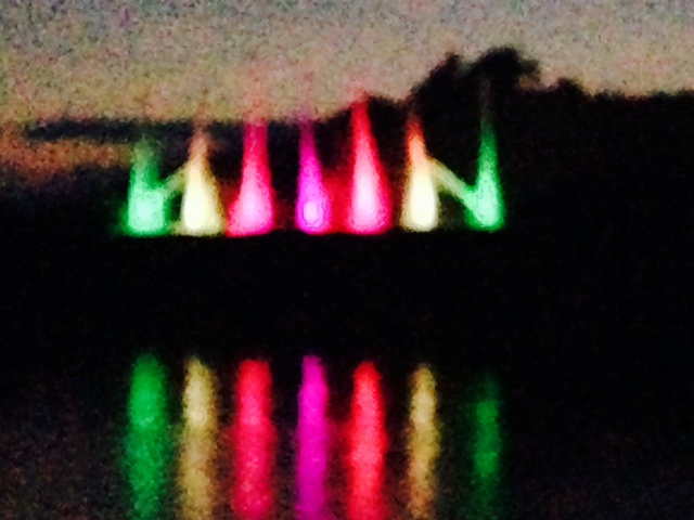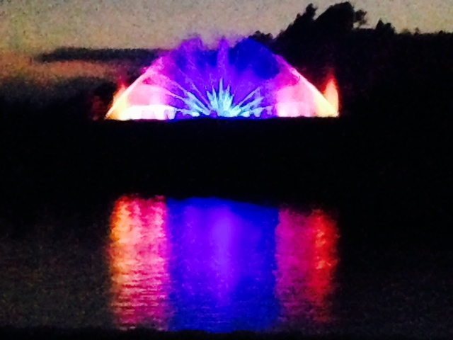 A view of the very professional light & fountain show across the Grand River – we were docked at the Municipal Marina right next to downtown and across from the light show, which we could watch from the bridge of the boat. The show is so popular that the town erected a grandstand on the waterfront directly across from the show. The fountain is nearly a football field long and contains 1300 nozzles (many of which fluctuate creating motion), 1.5 miles of pipe, nearly 4 miles of electrical cable, and shoots water 15 stories into the air!
