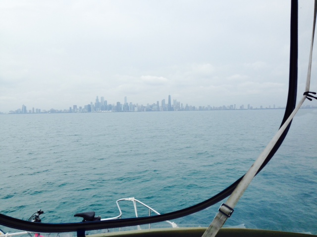We had two more days to get to Chicago by Friday – Paul had a flight to Tampa on Saturday morning to visit his Dad, and my son Danny, currently living in Ann Arbor, is coming to visit in Chicago over the weekend. Thunderstorms were predicted for both Thursday and Friday, so on Thursday morning we were up before daybreak analyzing various weather reports to determine our best and safest option. We therefore decided to leave at first light and head 95 miles directly across Lake Michigan to Chicago. It took us 7 hours, at one point being about 45 miles from the nearest landfall. The wind was 5-10 knots on our bow, and at one point we had to slow our speed for a ride which was more comfortable for us and the boat, though we were trying to arrive as early as possible to beat the predicted thunderstorms. Five minutes after we reached Chicago and tied up, it started to rain!