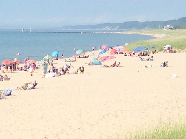 The beach at Saugatuck – typical of the beaches all along the shoreline of Michigan. Notice the twin breakwaters marking the harbor entrance in the background. The water here was noticeably warmer than further north