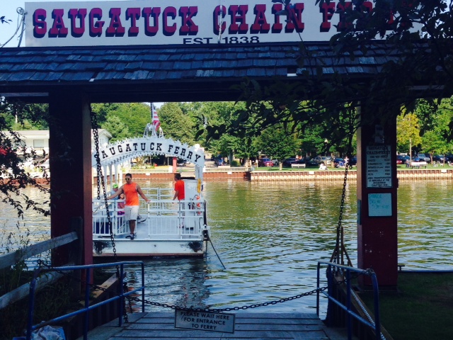 Saugutuck has a chain ferry that will take you across the river on demand – the ferry is literally connected to a chain that rests on the bottom and is attached to the ferry dock on each side. The operator (a college student) turns a crank on the ferry by hand, which pulls the ferry along the chain from one side to the other. It costs $1 – bikes are free!