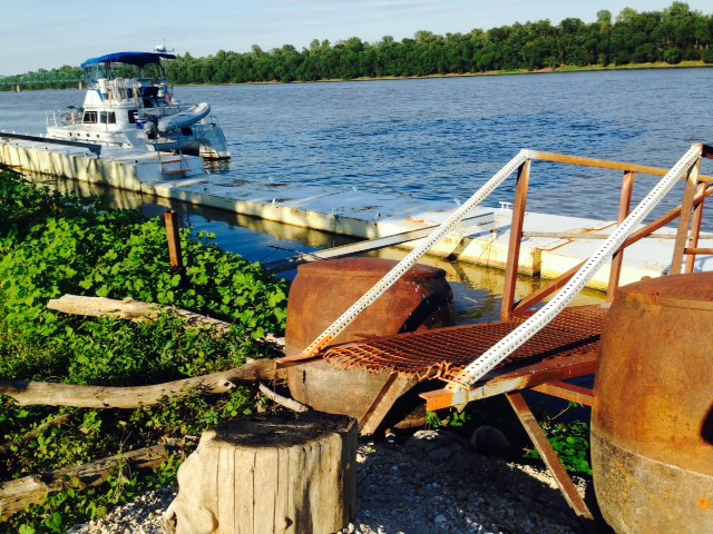 Our next stop was in in the town of Hardin at a restaurant along the river with a dock where we could tie up for the night – places to tie up are becoming more and more scarce. Not everyplace we dock is beautiful – this was nothing more that a rusty steel dock with a precarious ramp, but it was a secure place to stay for the night along with quite good food in the adjacent restaurant. The town was small and very depressed.