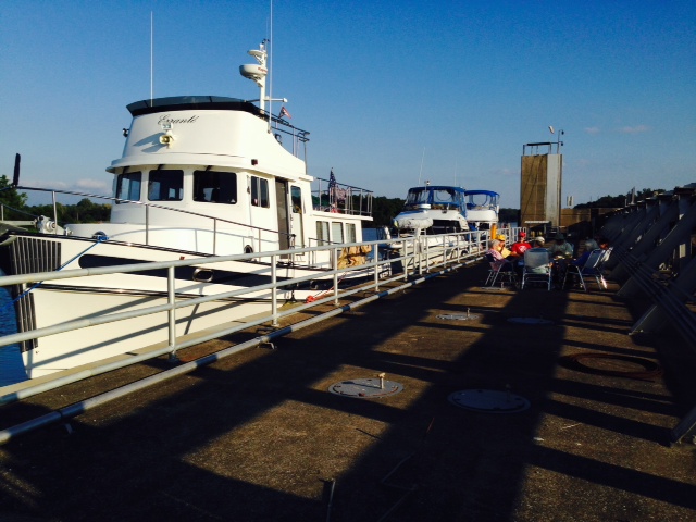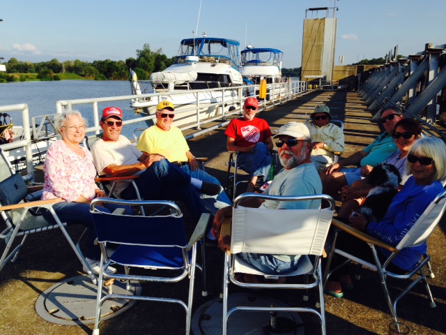 Out came the chairs, some snacks, and some spirits for an impromptu happy hour dock party with our new acquaintances from the other boats tied to the wall. Interesting stories, as one guy was a former airline pilot and another was a helicopter pilot. The guy on a boat we met earlier along the trip was an F-4 Phantom fighter pilot in the Viet Nam war