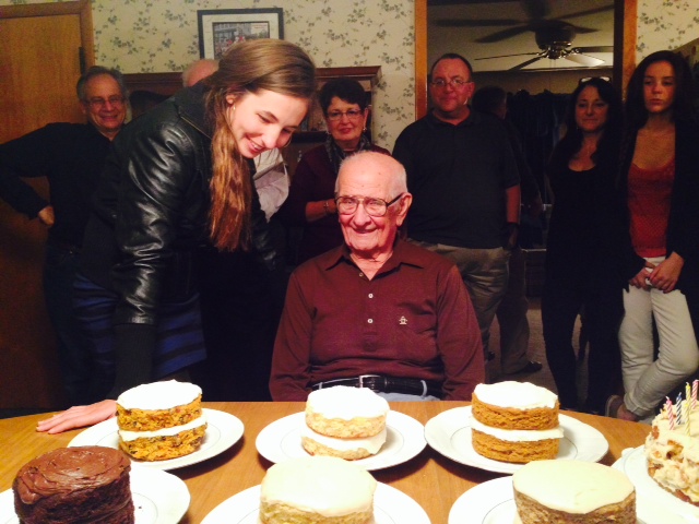 So a week or so ago, Jenny asked my Dad what her favorite cake is, to which he replied “I don’t know”. Jenny thought that by the time someone turns 90, they should know what their favorite cake is. So she made six cakes, all a different flavor, and had him taste each one to decide, once and for all, what his favorite cake is. Chocolate. Now he knows.
