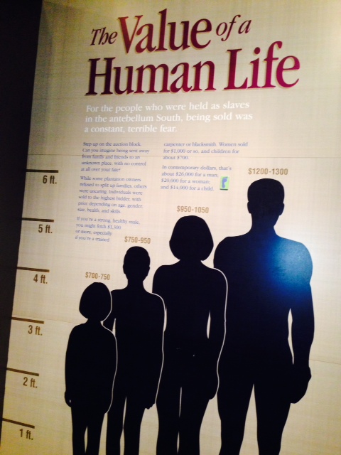 There is an excellent museum near Fort Conde called the History Museum of Mobile. In addition to a superb presentation of the history of the city and the surrounding area, the Museum addresses in a forthright manner the tragedy of slavery and its important role in the economy of Mobile prior to the Civil War. This famous and gut-wrenching statue of a slave at auction is presented in the Museum next to the chart below